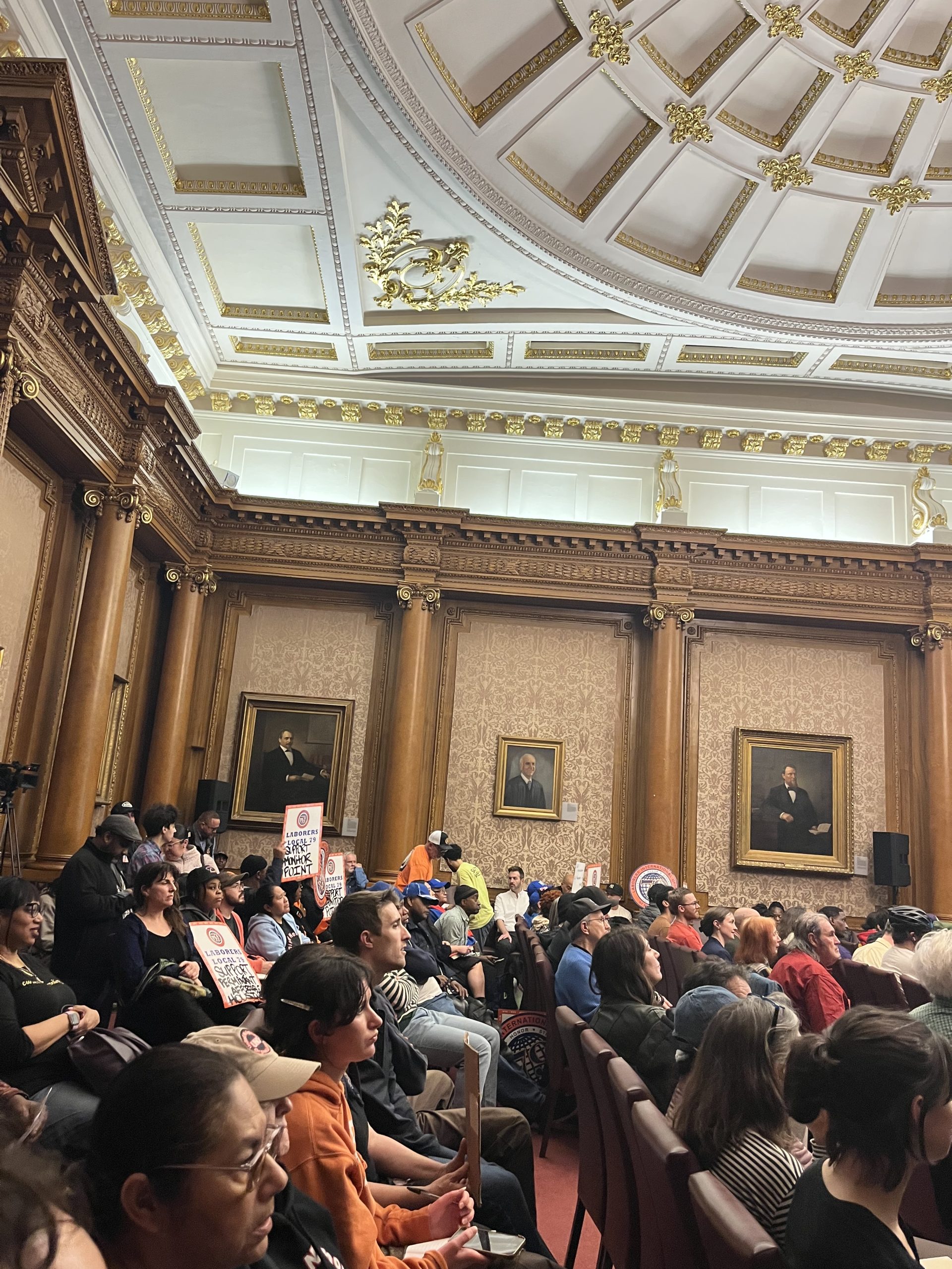 Union members hold signs in support of Monitor Point at a public hearing at Brooklyn Borough Hall on March 11.